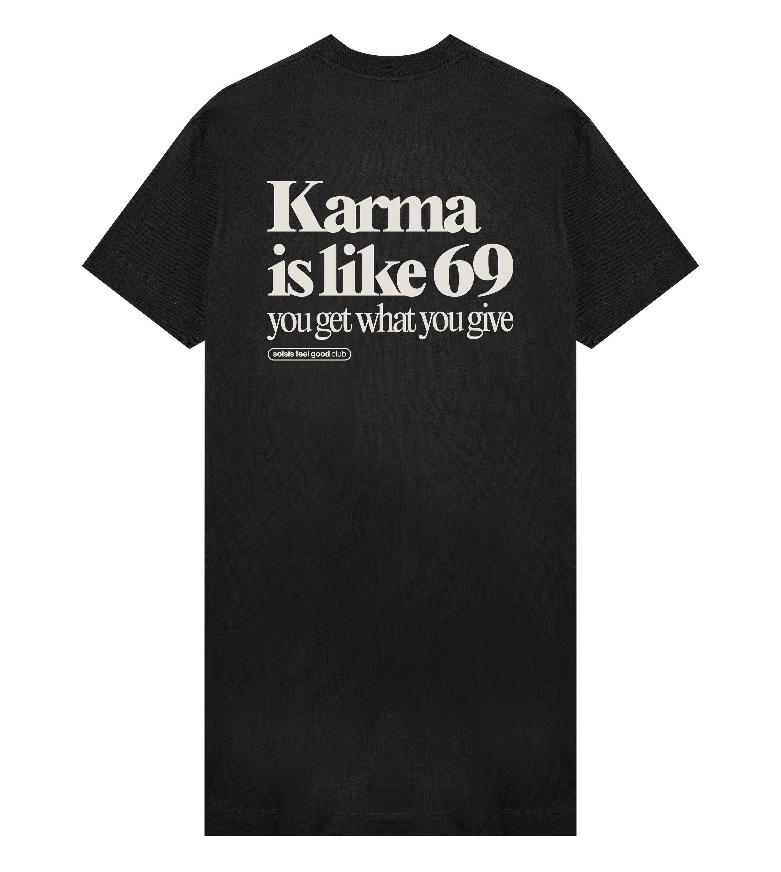 In zeitlosem Design gehalten, passt dieses T-Shirt Kleid zu jeder Gelegenheit und jedem Outfit. Der witzige weiße Aufdruck „Karma is like 69, you get what you give“ setzt ein klares Statement und zeigt, dass du Humor und Stil perfekt kombinierst.