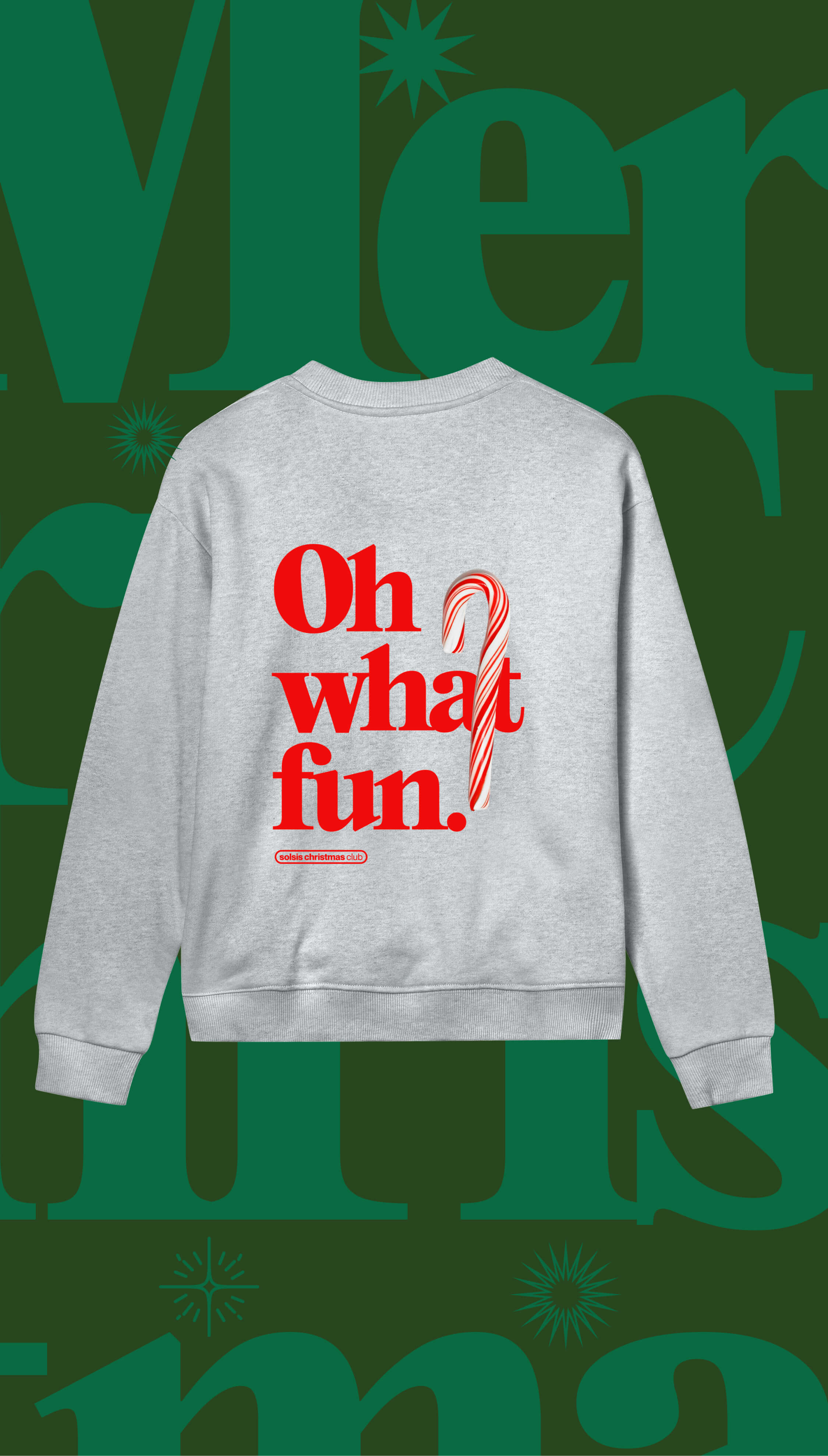 Vorne ganz clean mit dem Solsis Christmas Club-Logo, hinten dann das volle Festtags-Statement: „Oh what fun.“ in boldem Rot mit Candy Cane Twist.