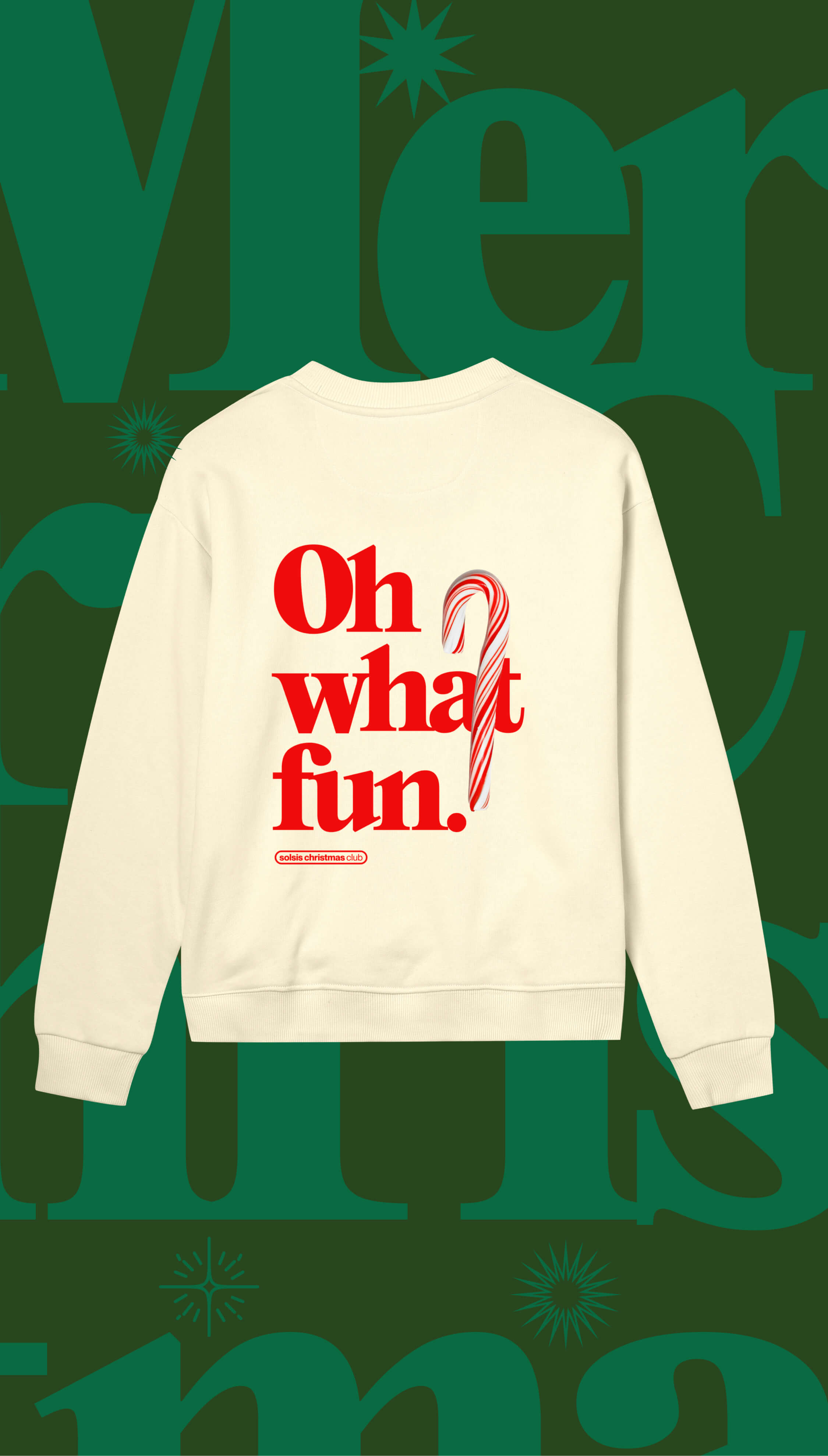 Vorne ganz clean mit dem Solsis Christmas Club-Logo, hinten dann das volle Festtags-Statement: „Oh what fun.“ in boldem Rot mit Candy Cane Twist.