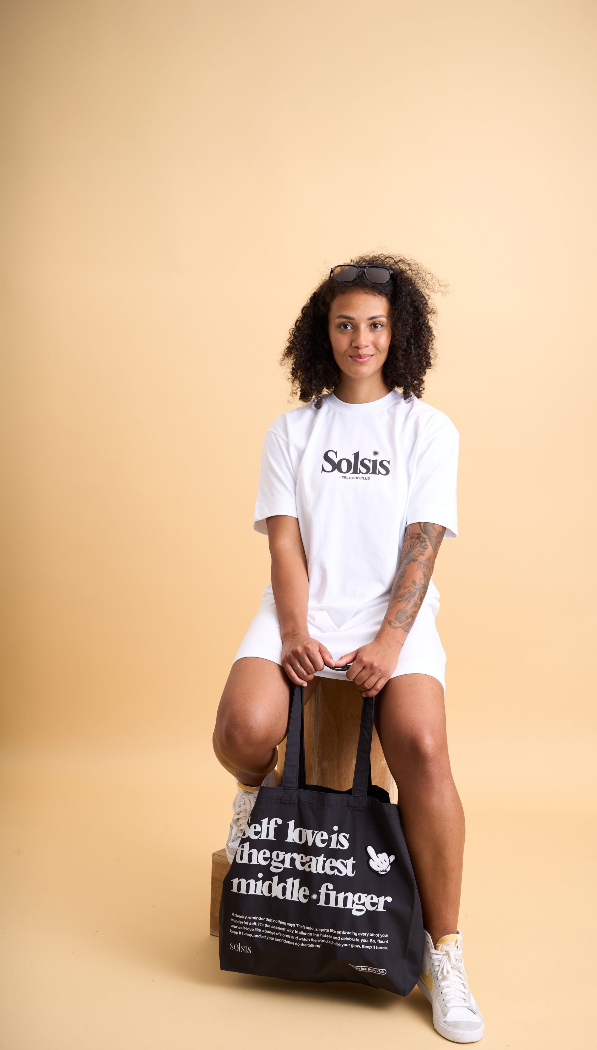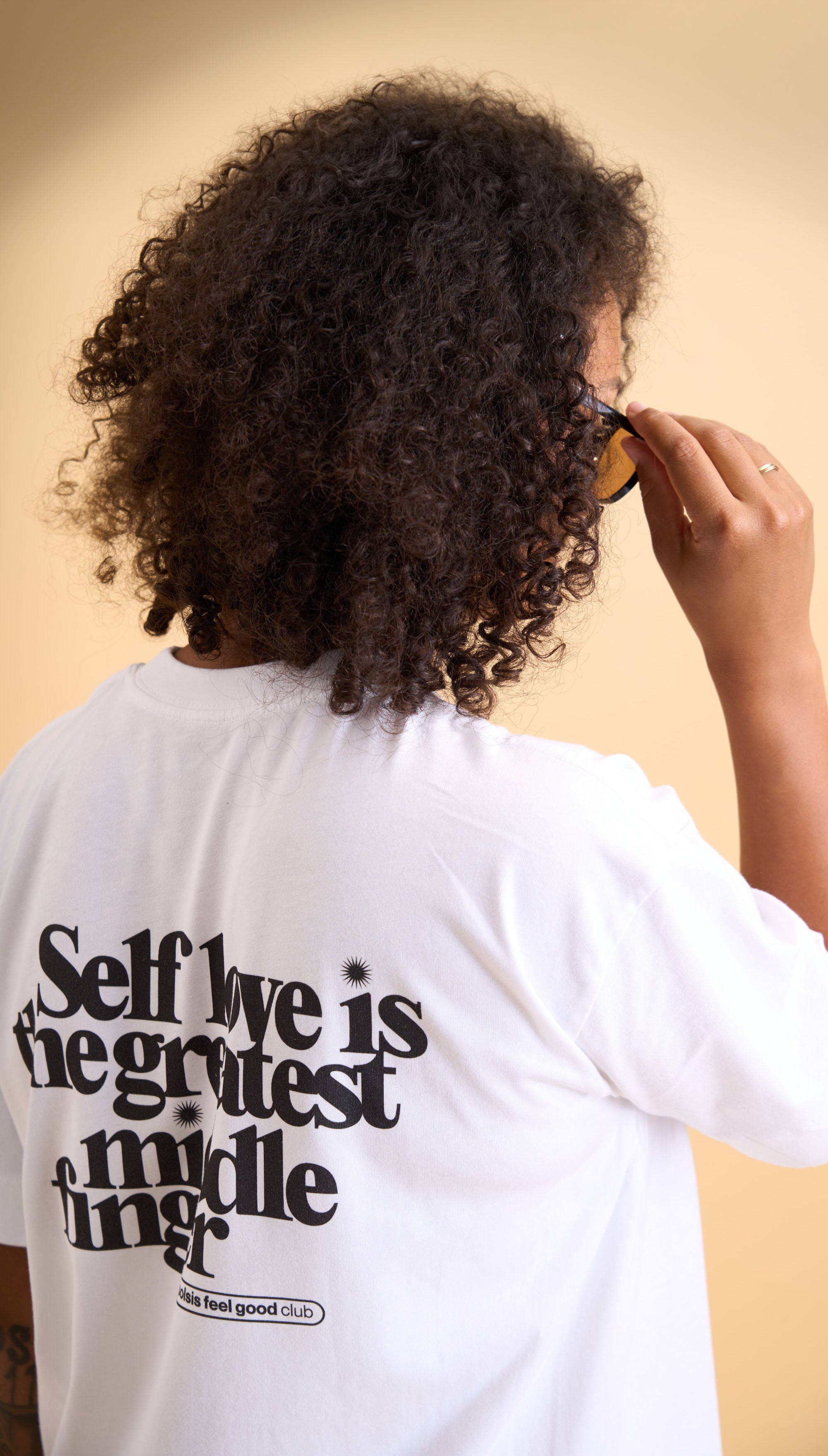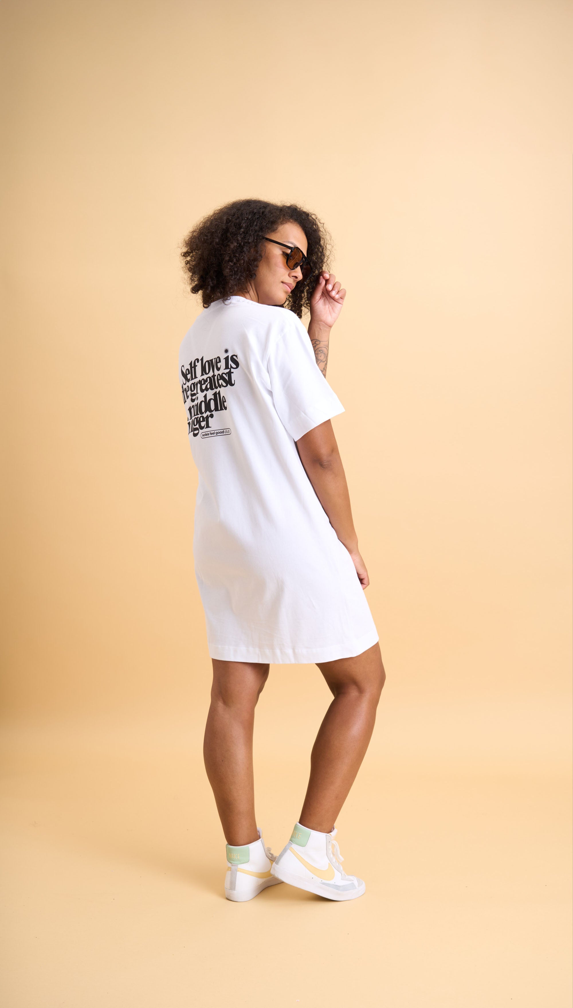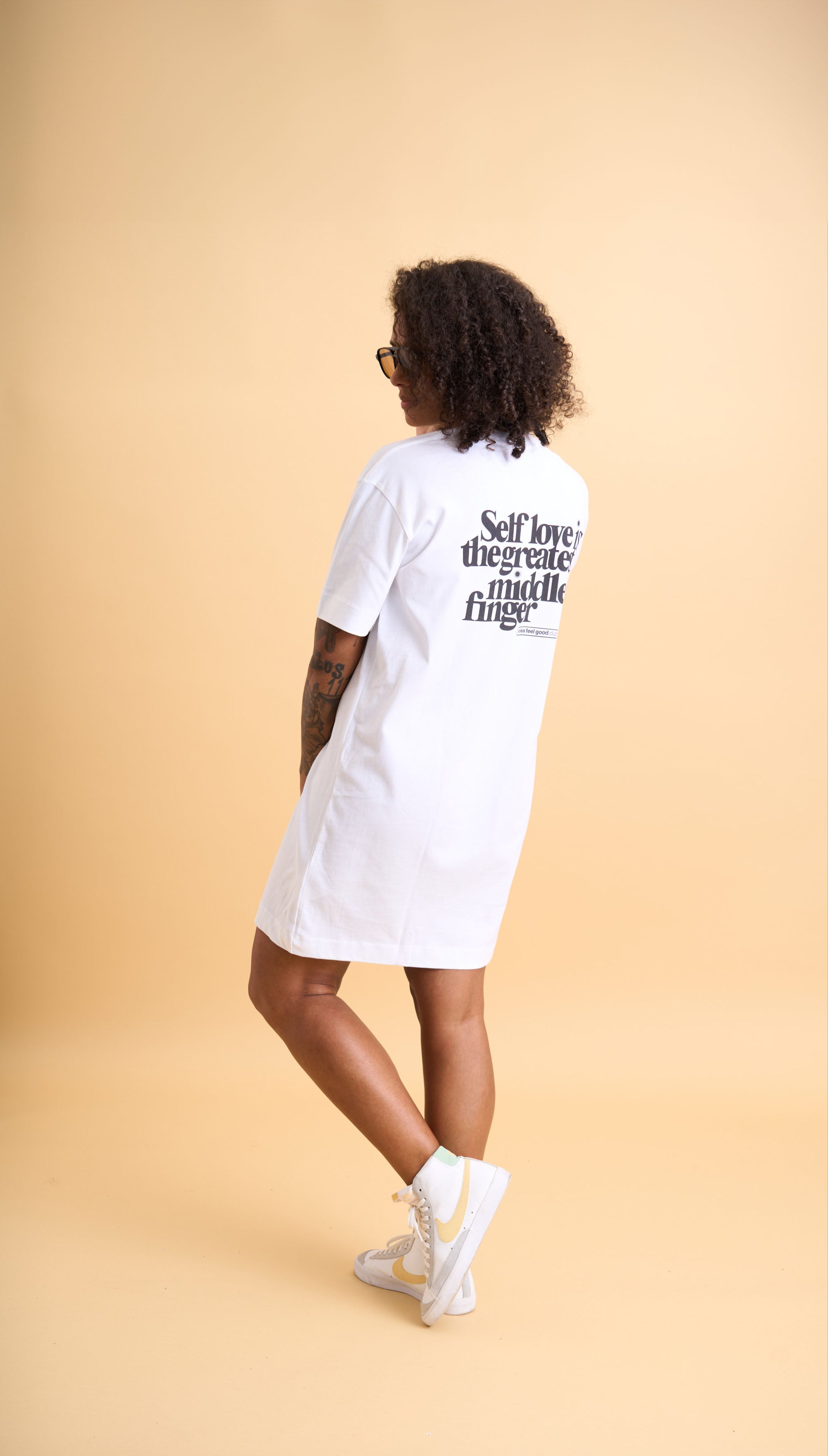 In klassischem Weiß gehalten, passt dieses Tee Dress zu jeder Gelegenheit und ist ein echter Hingucker. Der markante schwarze Aufdruck „Selflove is the greatest middlefinger“ zieht alle Blicke auf sich und zeigt klar, dass du dich selbst an erste Stelle setzt und stolz darauf bist.